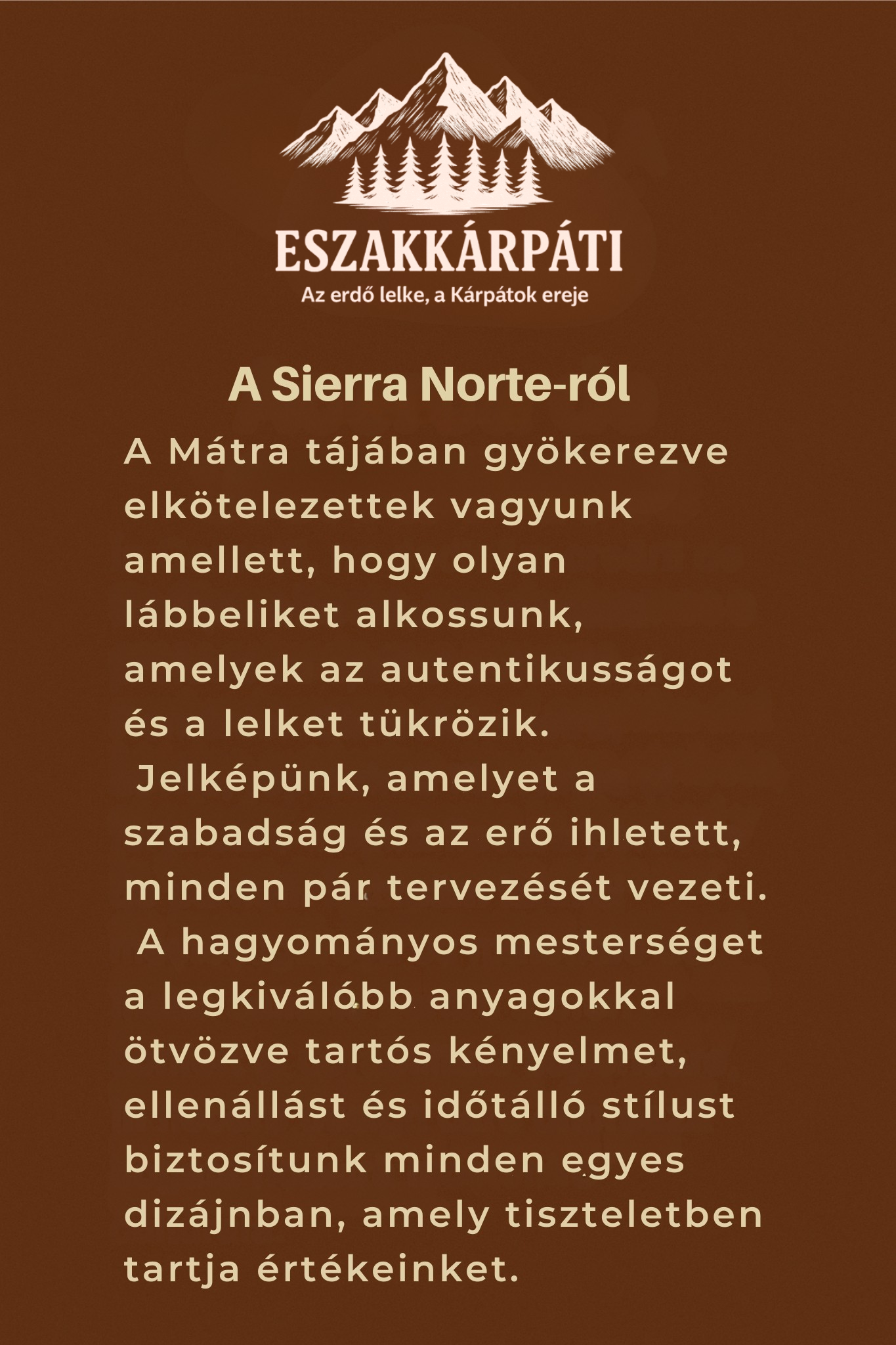 "Ăjra összekapcsoljuk az embert a lĂ©nyegekkel: a heggyel, a tiszta levegĆvel Ă©s a magyar földdel. A ESZAKKĂRPĂTI egy meghĂvĂĄs arra, hogy cĂ©llal jĂĄrjunk Ă©s identitĂĄssal öltözzĂŒnk."